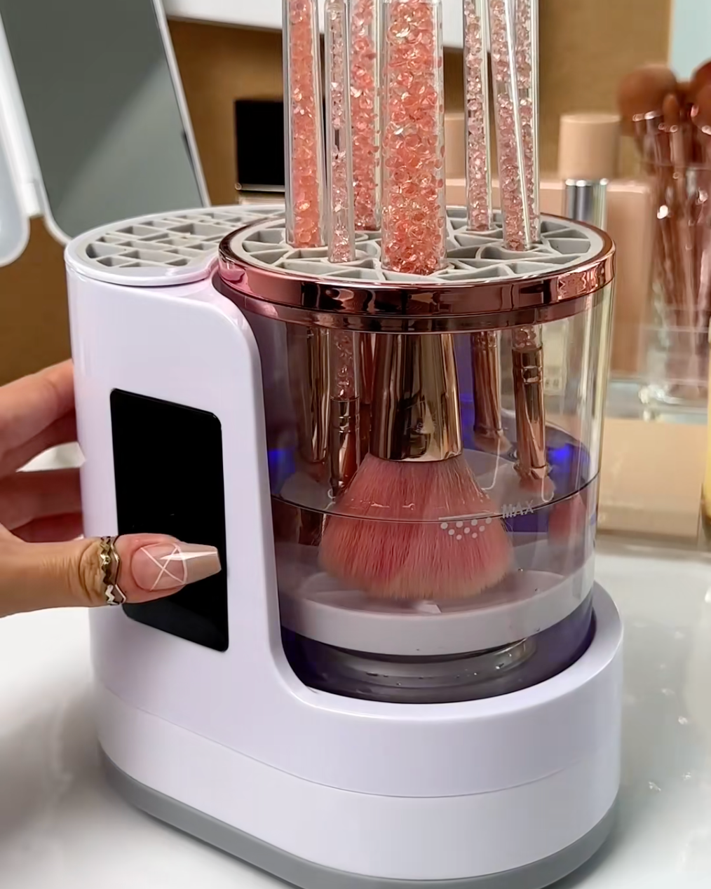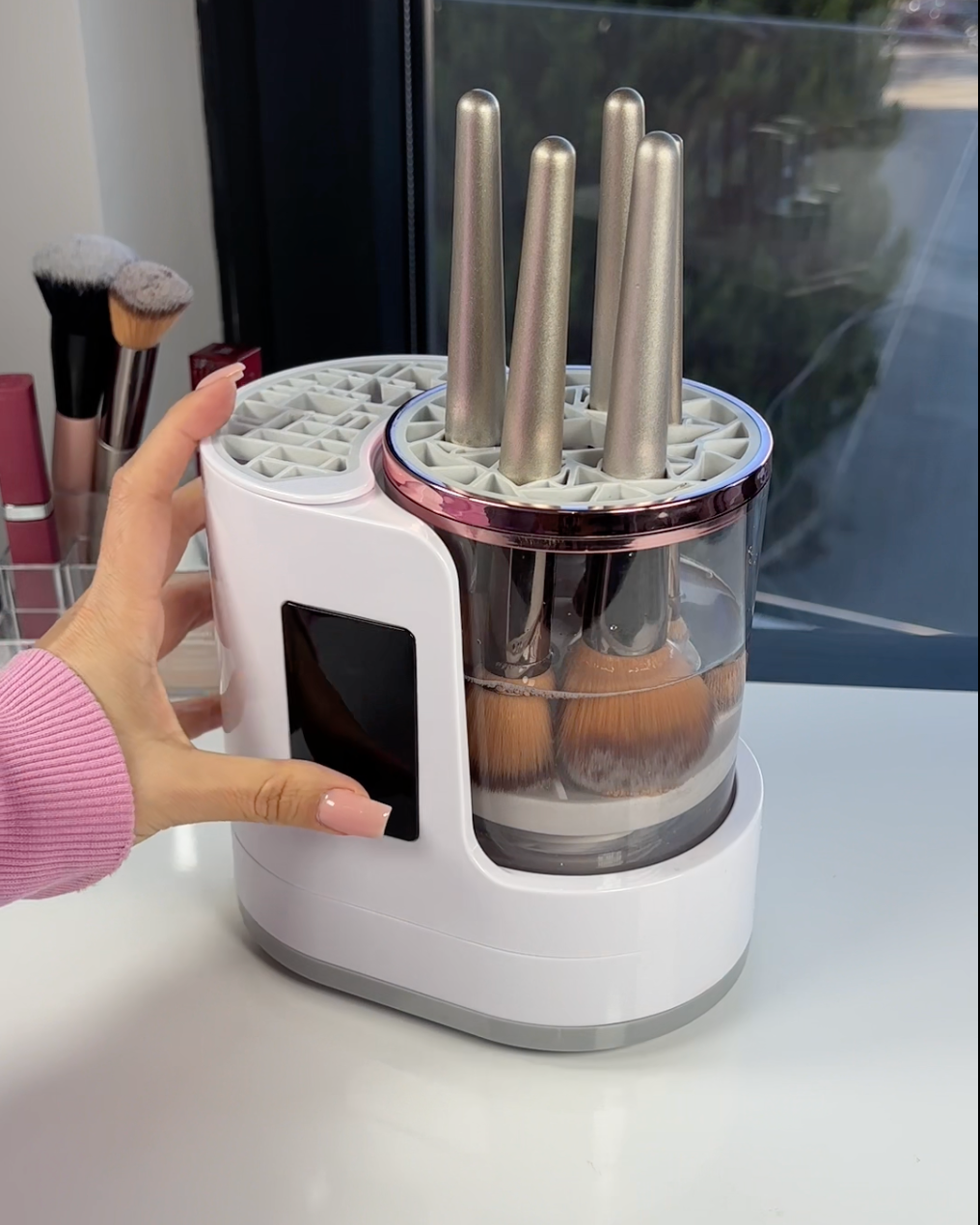 Vår Sminkborstrengörare – Pro Modell rengör och torkar dina sminkborstar snabbt och effektivt, förlänger deras livslängd och håller din hud fri från bakterier. Med sin användarvänliga design sparar du tid, får snabb torkning och kan alltid njuta av en fräsch och felfri makeup! ✨💄